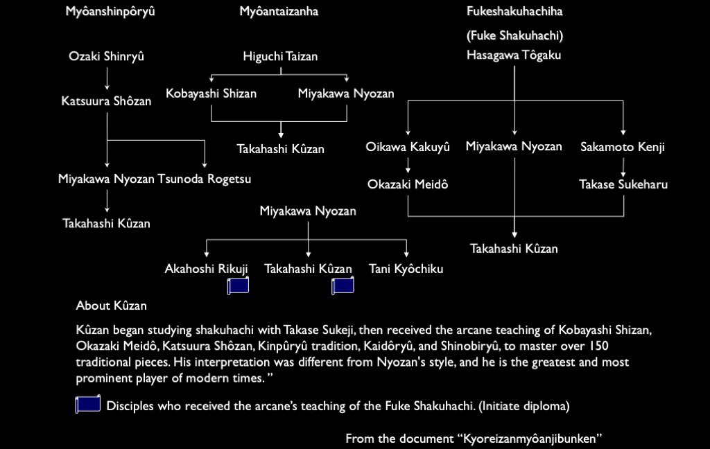 It is mentioned in the document “The temple Myoan of the Mountain Kyorei” written by Tsukamoto Kido that “Kûzan was transmitted with the essence of Shakuhachi from Kobayashi Shizan, Okazaki Meidô, Katsuura Shôzan, and mastered the art of the different schools Kinpû-ryû, Kaidô-ryû, and Shinobi-ryû. It is said that he received the transmission of more than 150 pieces of the traditional repertory. His playing was different from Nyozan and he is the greatest and the most recognized player of the modern age.”
