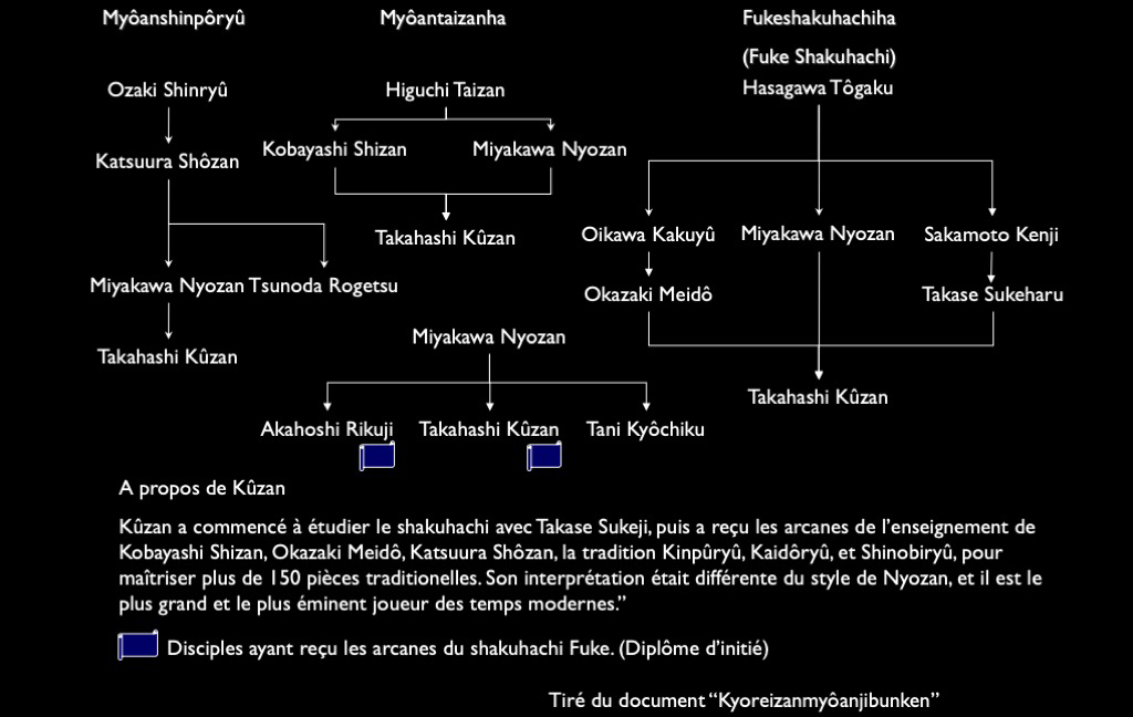 Il est mantionné dans le document “Le temple Myoan de la montagne Kyorei” écrit par Tsukamoto Kido que “Kûzan s’est vu transmettre l’essence du Shakuhachi de maîtres comme Kobayashi Shizan, Okazaki Meidô, Katsuura Shôzan, et maîtrise de plus l’enseignement des écoles Kinpû-ryû, Kaidô-ryû, et Shinobi-ryû. Il est dit qu’il a reçu l’enseignement de plus de 150 pièces du répertoire traditionel. Son interprétation était différente de Nyozan, et il est le plus grand et le plus éminent joueur des temps modernes.”